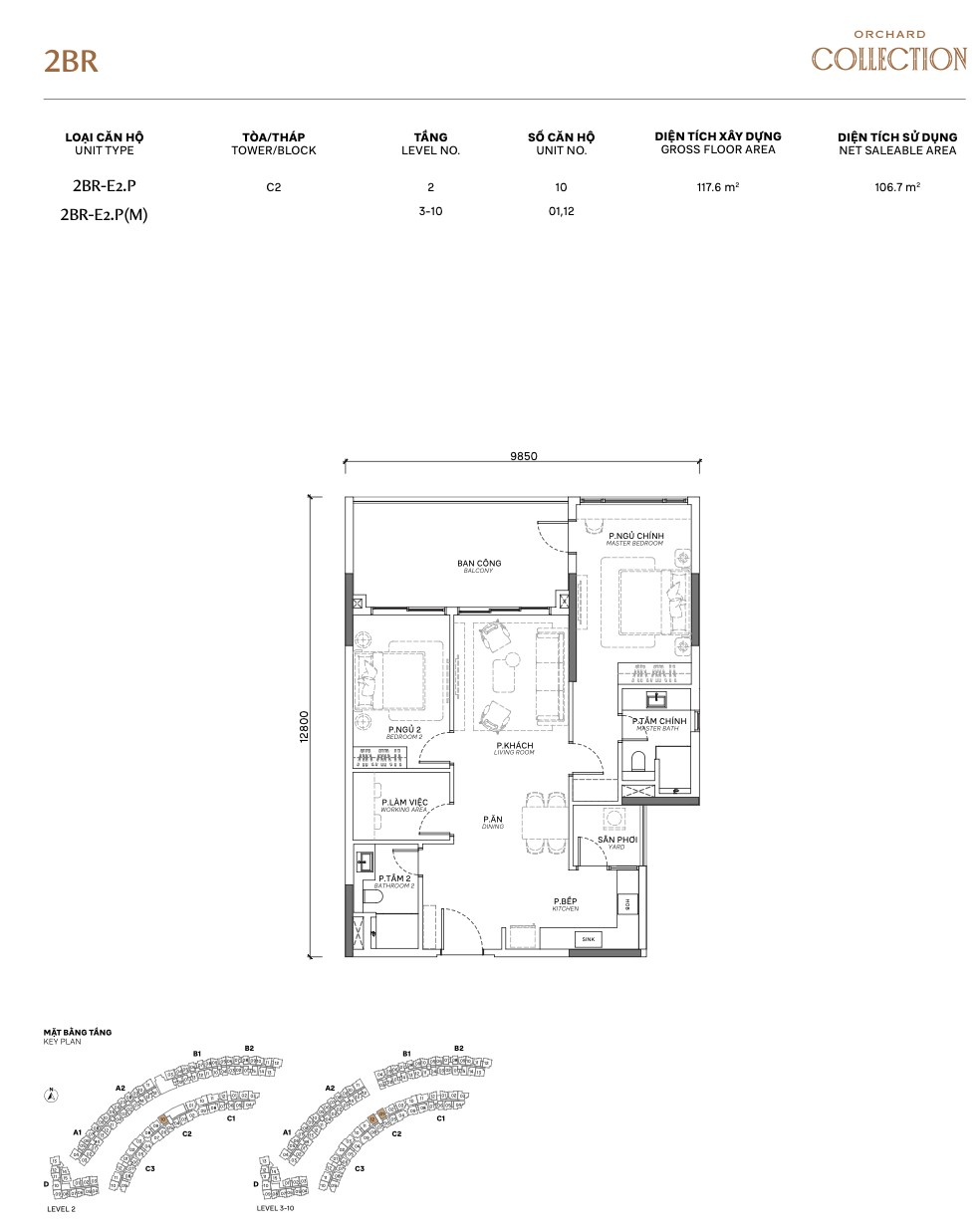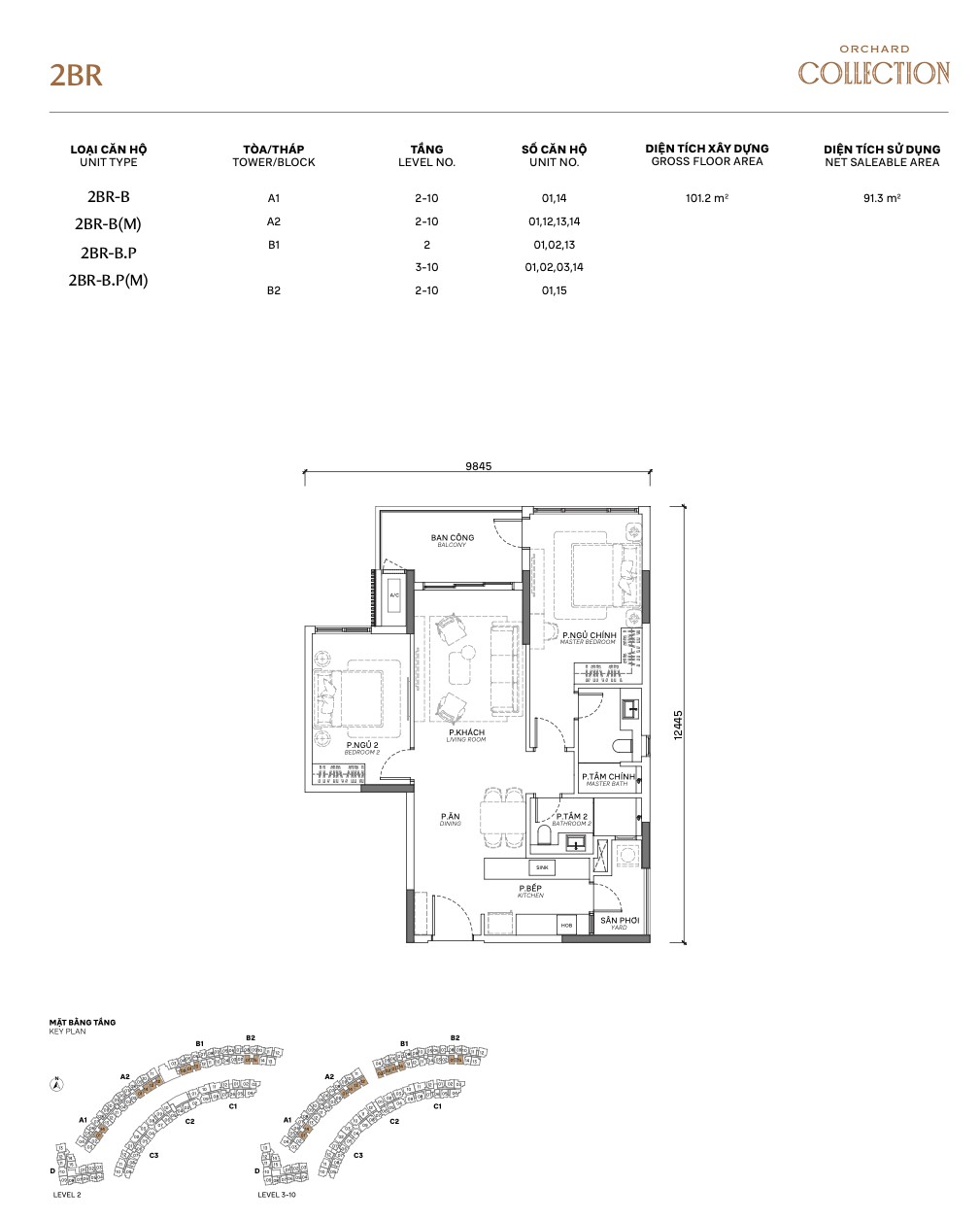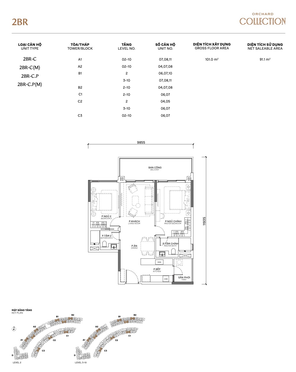| 2BR Standard | A / B / C | 91–110m² | 75–88m² | 2–10 | A, B, C | Full-size 2BR, dual balcony options |