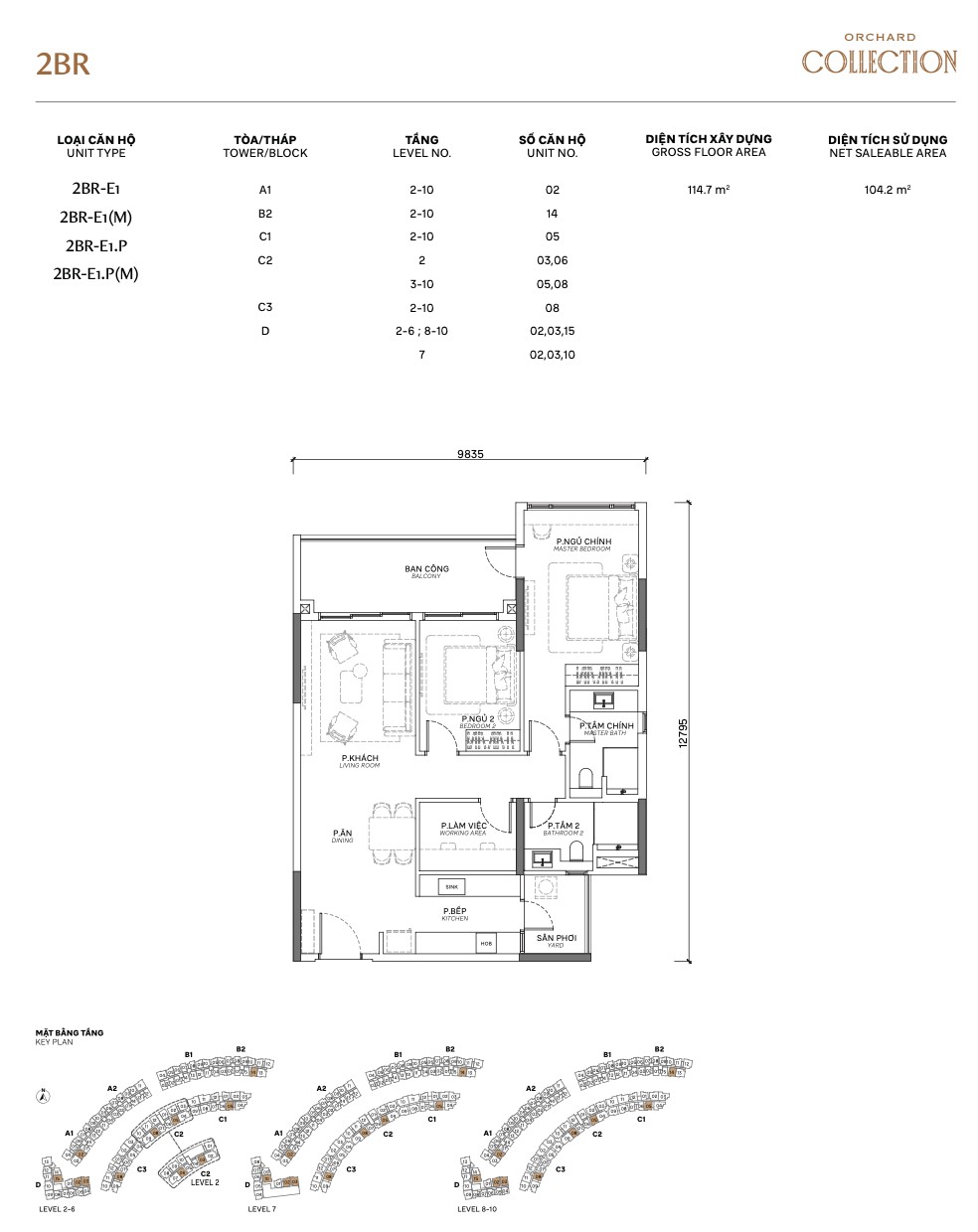 | 2BR Standard | E1 / E2 | 88–95m² | 72–78m² | 2–10 | B, D | Study nook + large balcony |