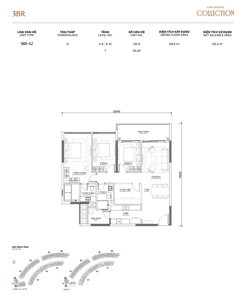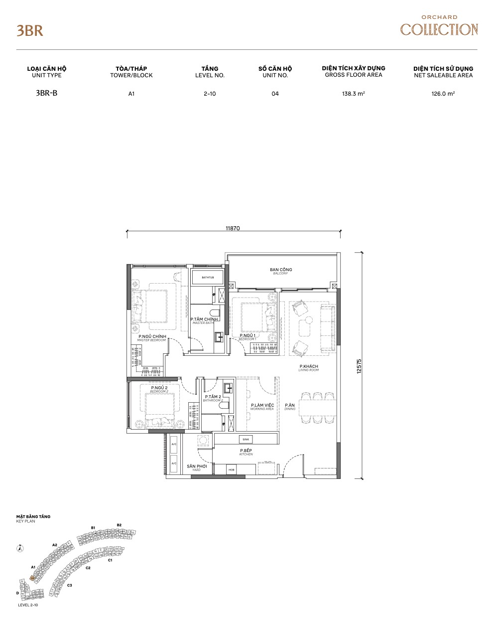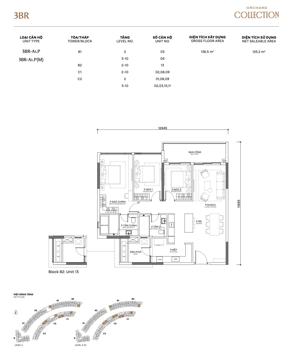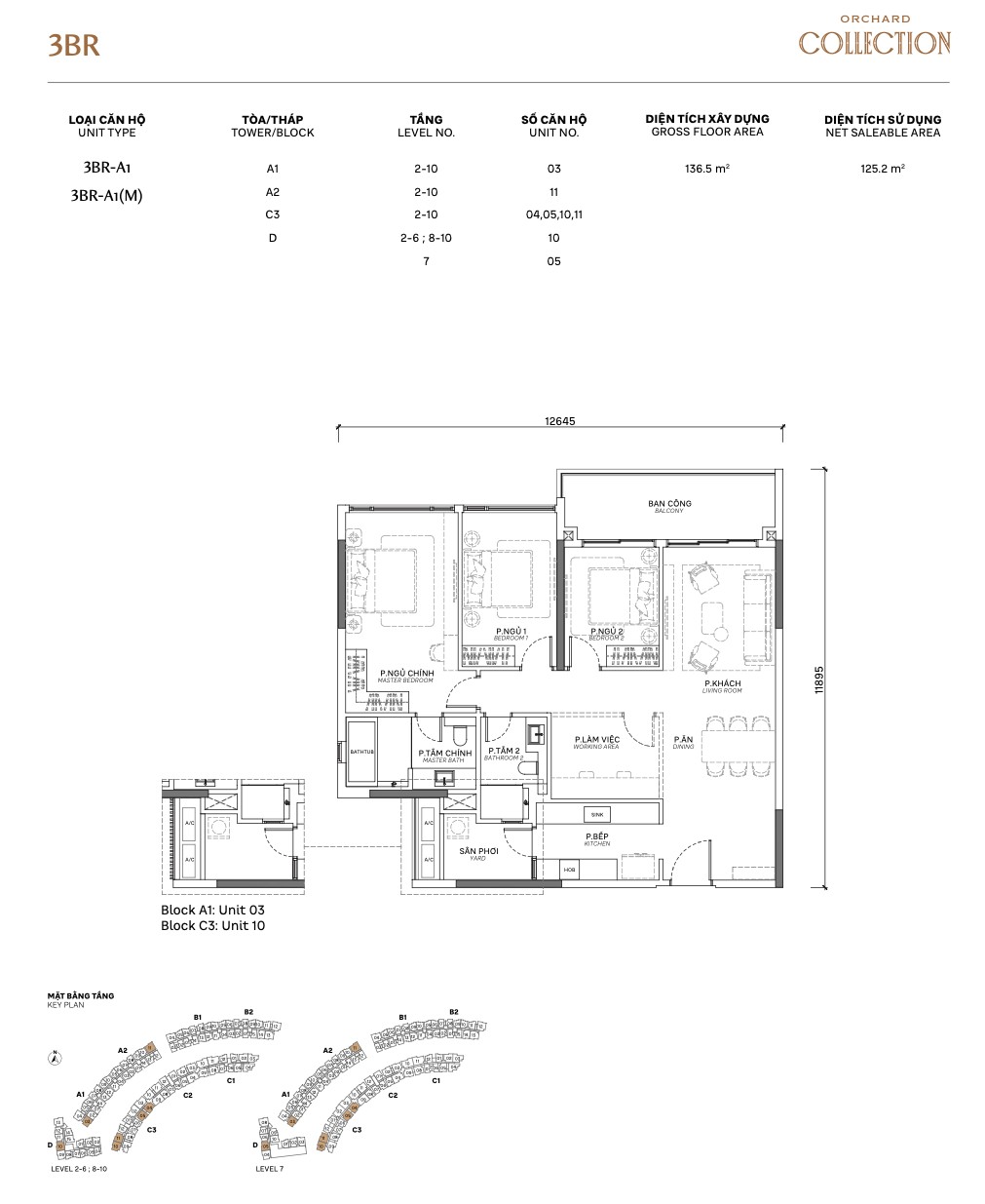 | 3BR Standard | A1 / A1.P | ~125m² | ~100m² | 2–10 | A, B | Flagship layout, walk-in wardrobe |