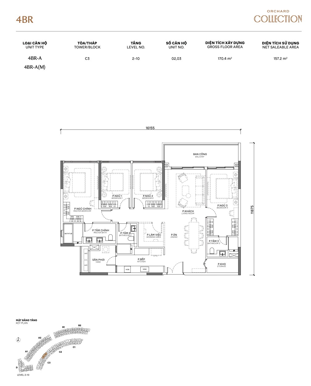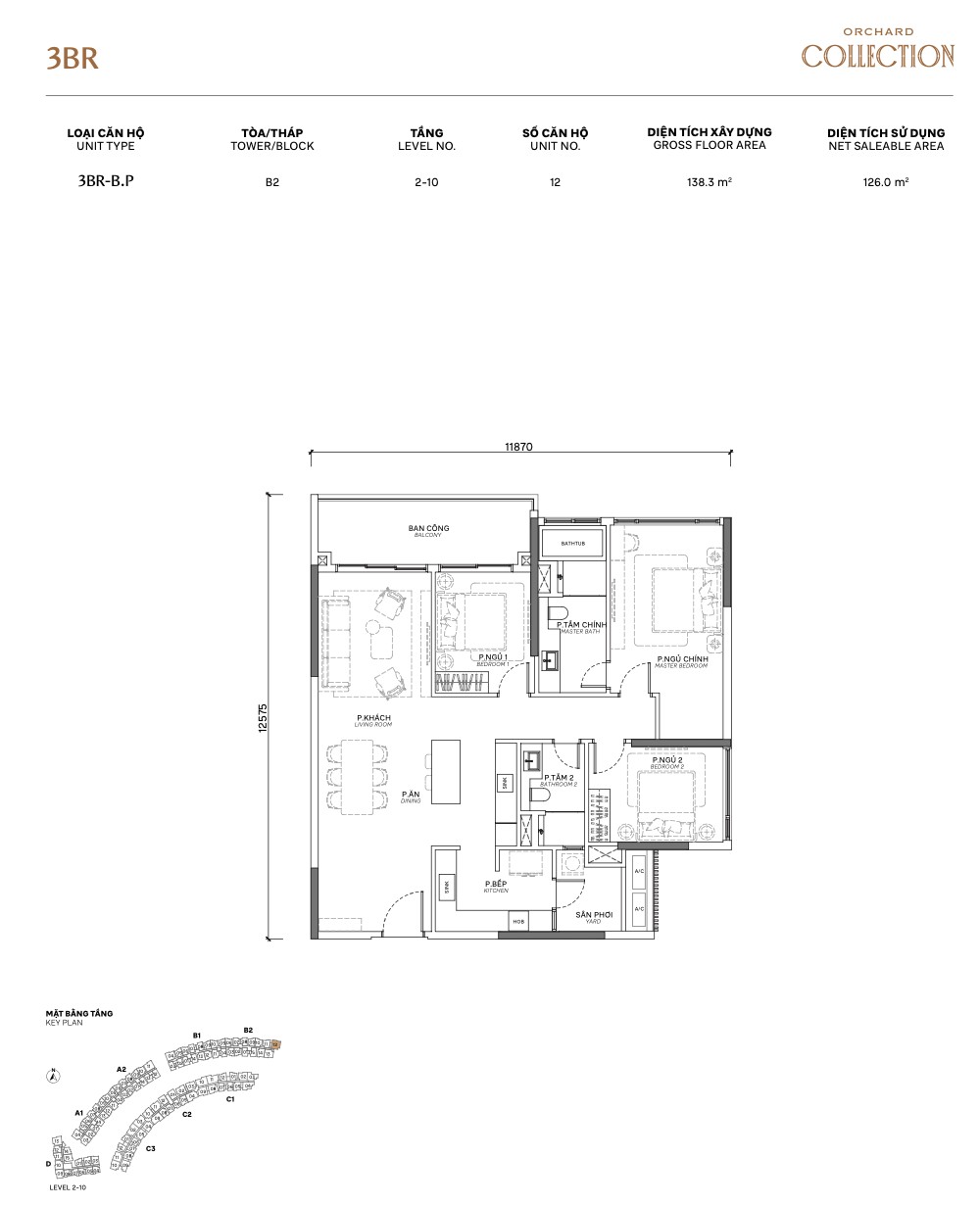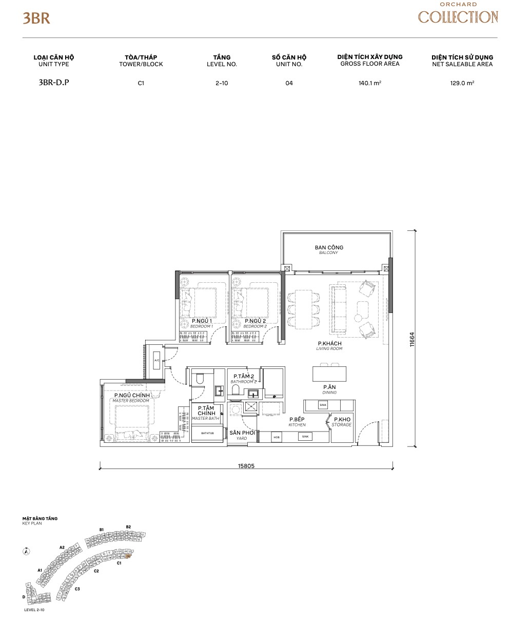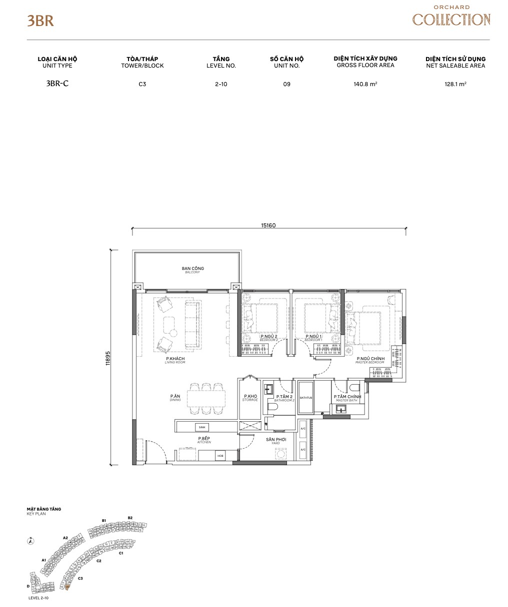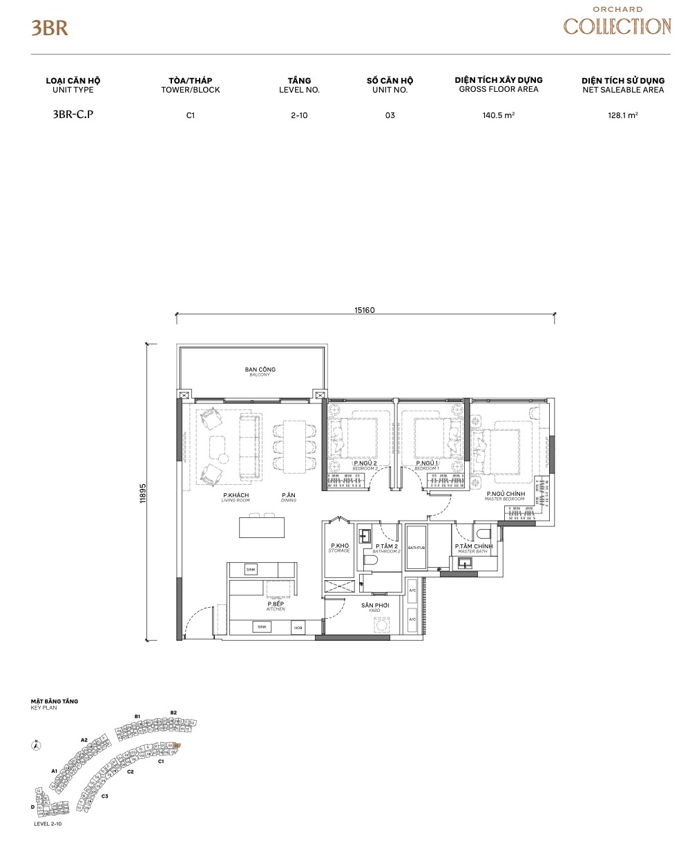 | 3BR Standard | C / C.P | ~118m² | ~94m² | 2–10 | C | Corner unit, dual aspect |