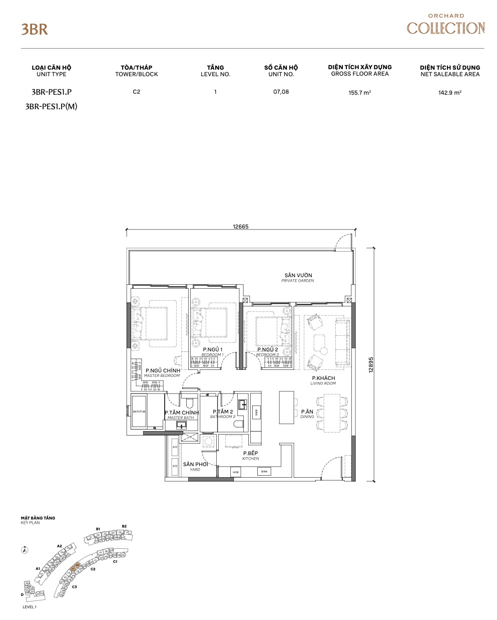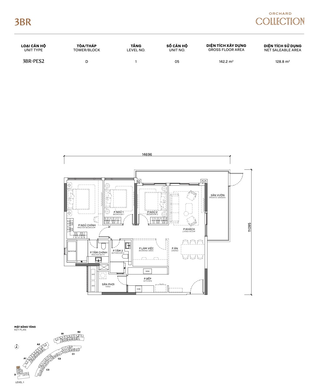 - 3BR-PES2 (Define Tower D): 142.2m² GFA — ground floor, garden view