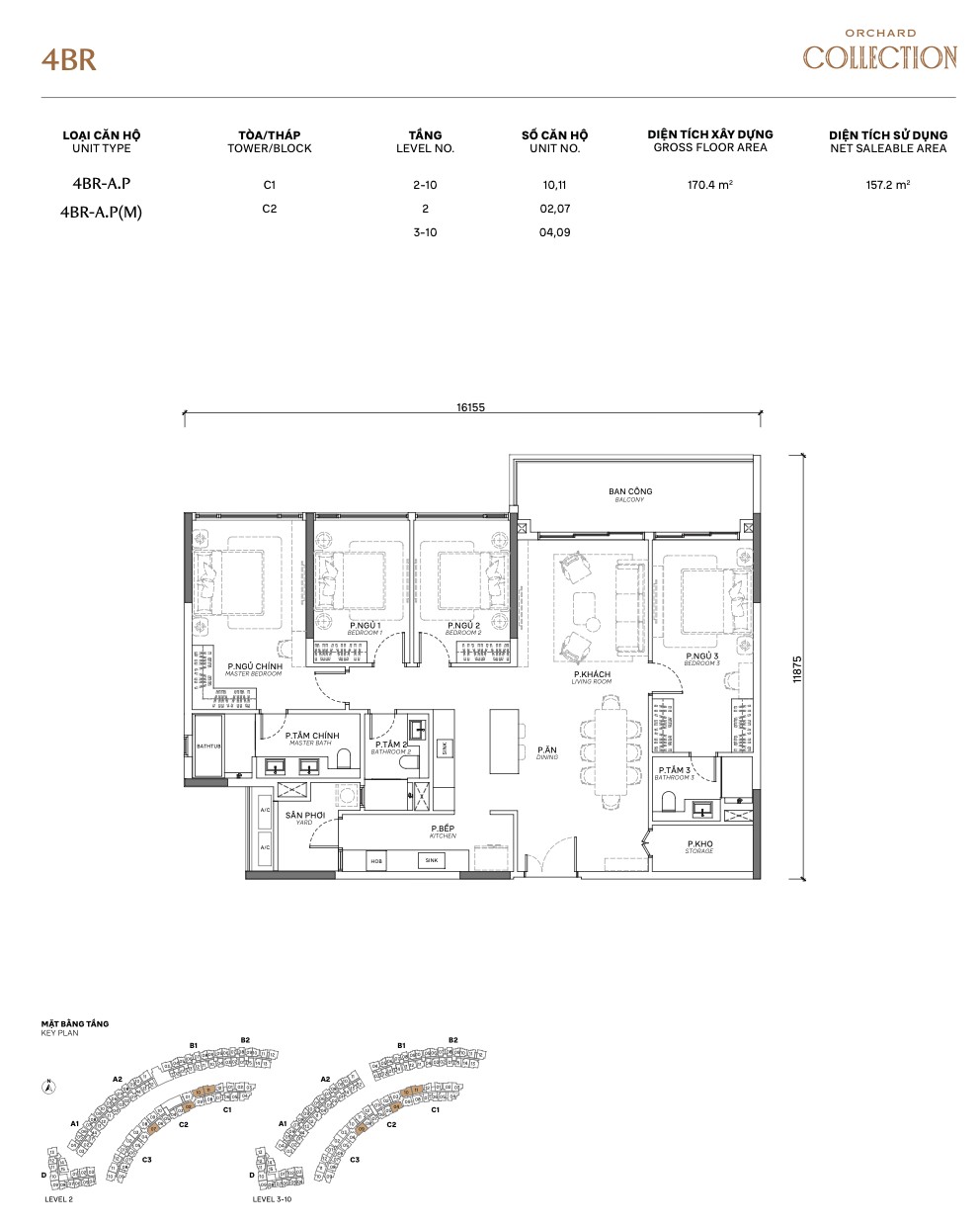 | 4BR Standard | A / A.P | ~157m² | ~130m² | 2–10 | D | Largest non-PES apartment |