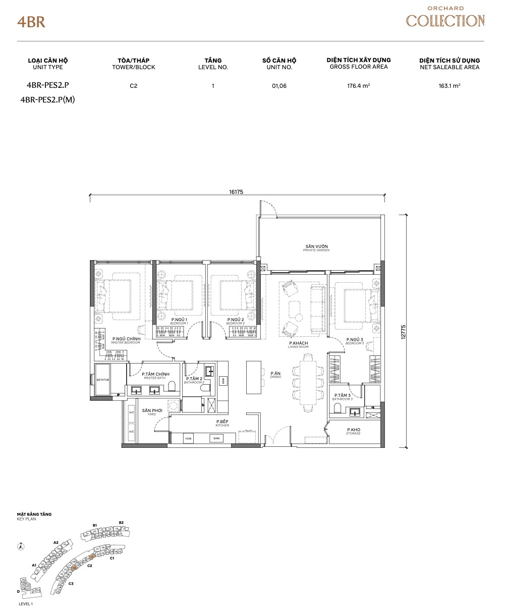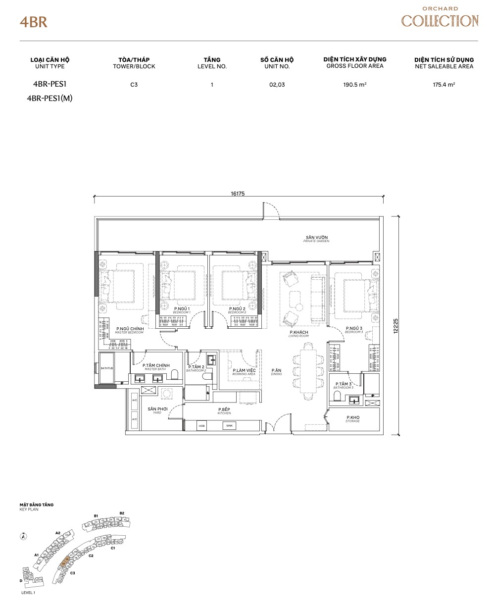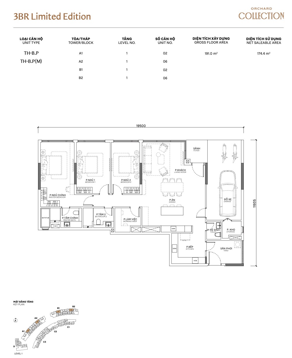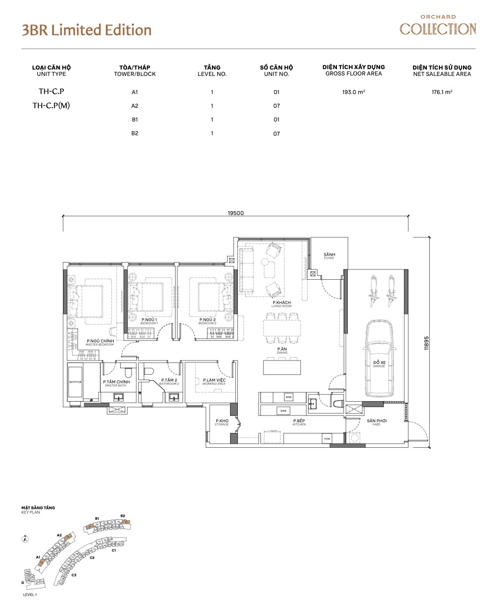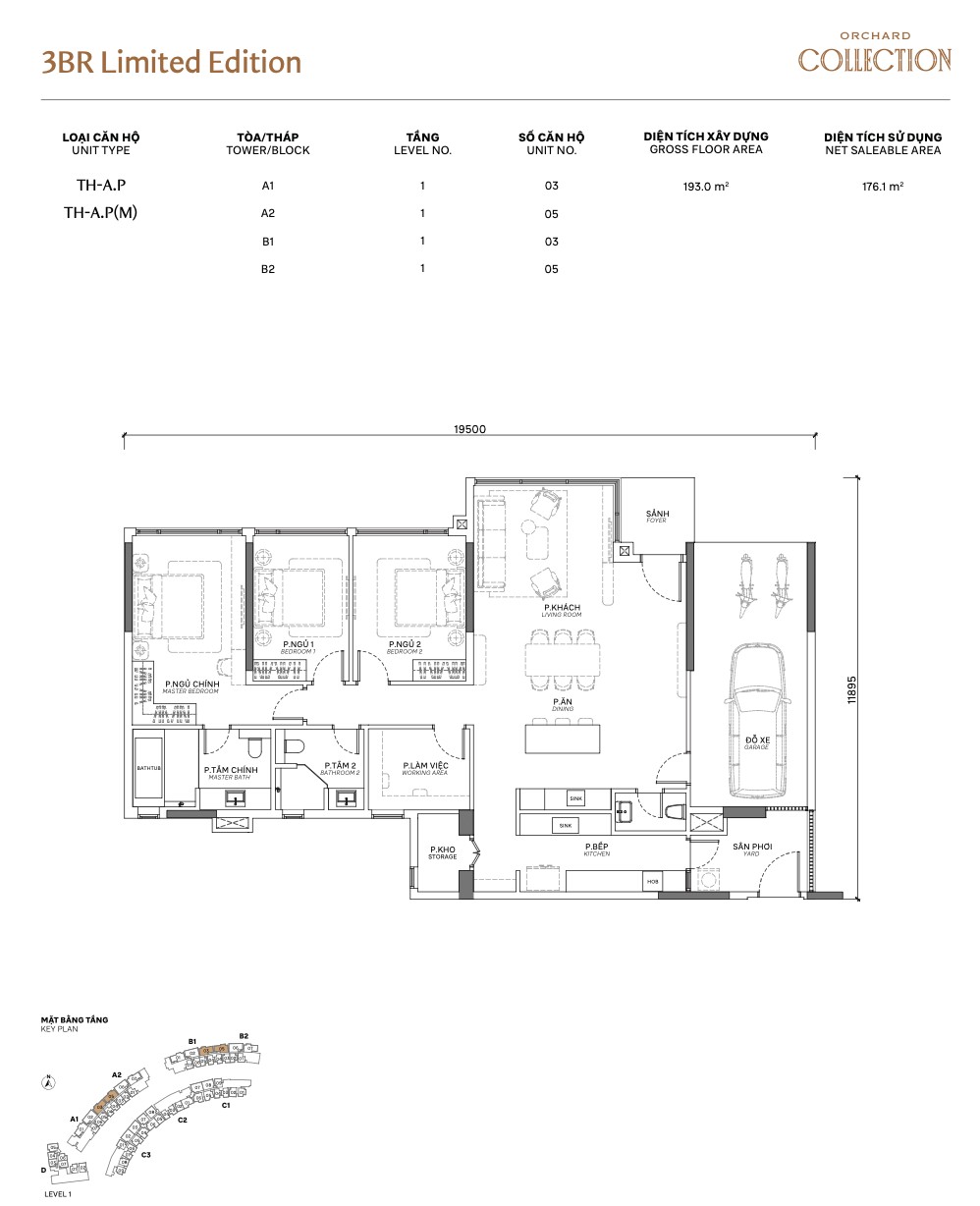 The 3BR Limited Edition (TH series) is the crown jewel of Orchard Collection’s ground-floor offering. At 193m² GFA / 176.1m² NSA, these are the largest and rarest units in the project — only available on Level 1 across all 4 towers. The defining feature: a private enclosed garage (gara xe) for one car, embedded within the unit’s footprint.