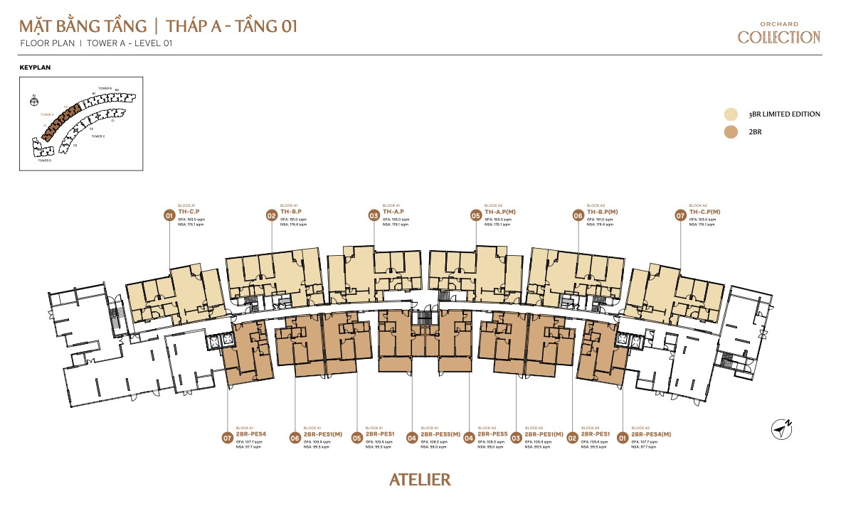 Atelier Tower A is the most varied block, housing 8 different 2BR sub-types (A, B, C, E-PES, PES1, PES4, PES5) and all 3BR Limited Edition TH-A units with private garage. Block A1–A4 runs in a curved arc orientation giving corner units excellent dual-aspect views. Ground floor (1F) hosts PES and Limited Edition garage units; upper floors (2–10) are pure apartment layouts.