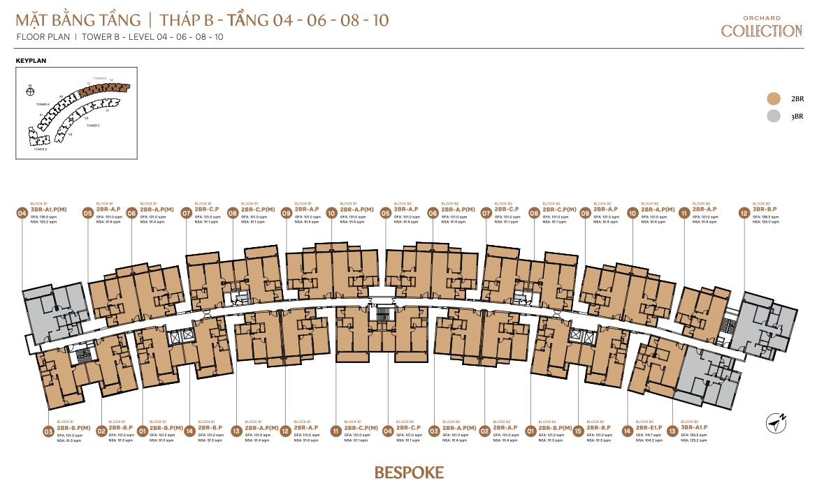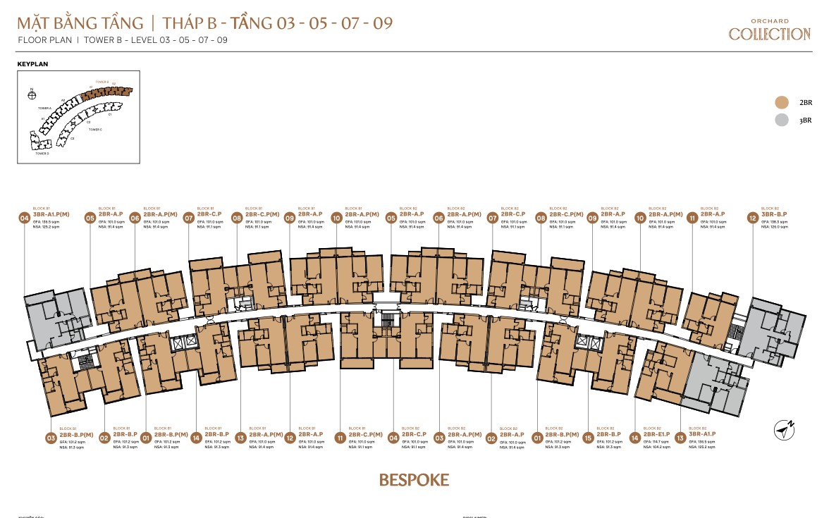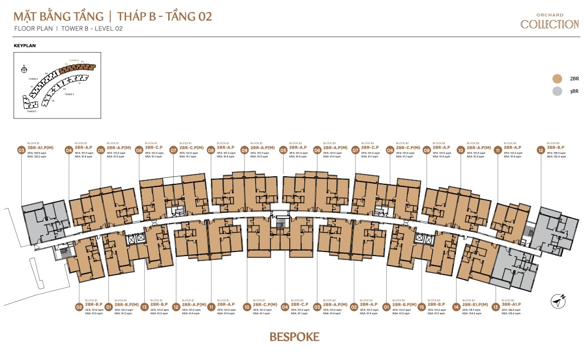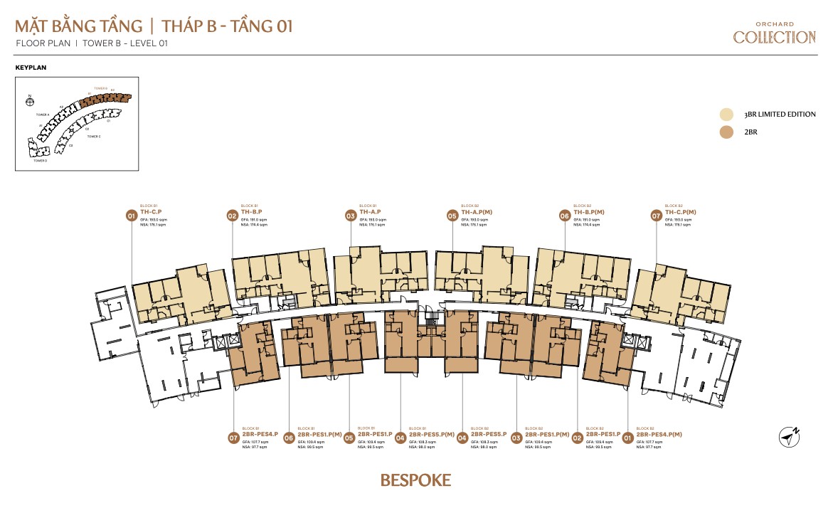 Bespoke Tower B is the most concentrated block, with 2BR-D, 2BR-E1, 2BR-PES3, 2BR-PES6, 2BR-PES7 plus 3BR-A1, 3BR-B, 3BR-C, and 3BR Limited TH-B garage units. Its smaller footprint (2 blocks only) means fewer units per floor and potentially wider corridors. B1 and B2 mirror each other, so B1 units face east while B2 units face west.