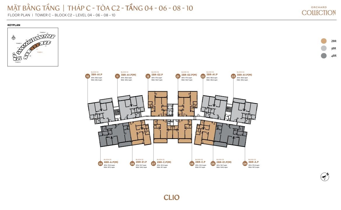 | 3BR Standard | A2 | ~120m² | ~96m² | 2–10 | C | Clio tower exclusive |