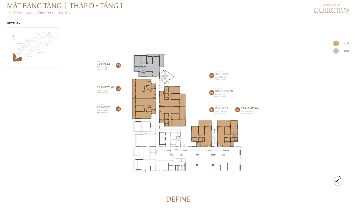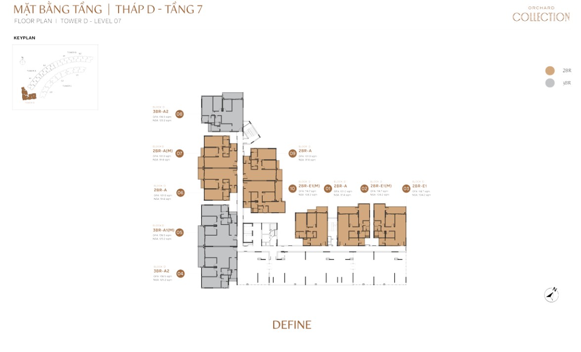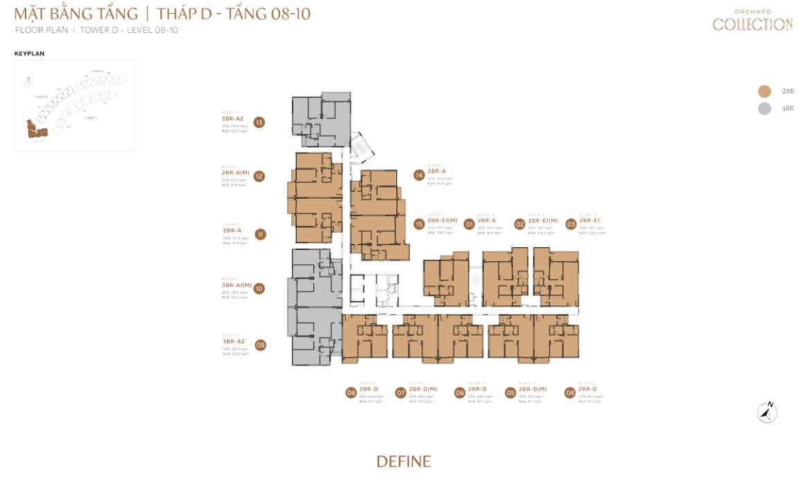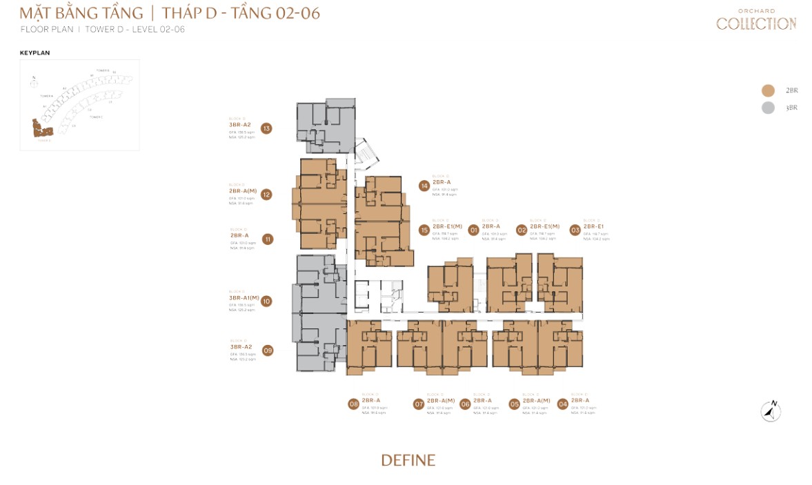 | 3BR-D.P | ~112m² | ~90m² | D | Define tower only, compact 3BR + garden balcony |