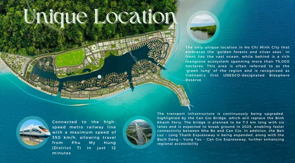 Additionally, the project is located near the future Can Gio International Transshipment Port, envisioned as a global logistics and trade hub, and offers fast connectivity to the Cai Mep – Thi Vai deep-water port cluster. Key transport routes such as the Ben Luc – Long Thanh Expressway, Rung Sac Road, and the proposed Can Gio – Vung Tau sea-crossing route will further enhance regional connectivity, driving strong economic and tourism growth.