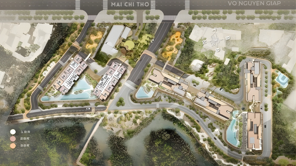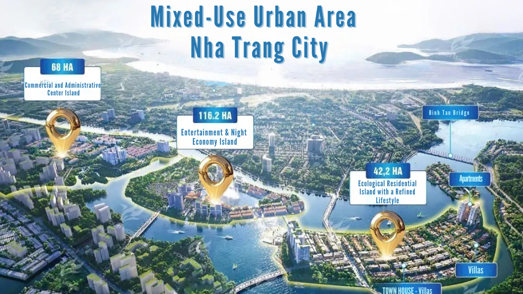 The project is surrounded by rivers on three sides, creating a unique landscape, high ecological value, optimized waterfront views, and enhanced real estate value. It is master-planned to international standards with modern infrastructure, premium amenities, and abundant green spaces, aiming to become a new tourism and economic icon of Nha Trang.