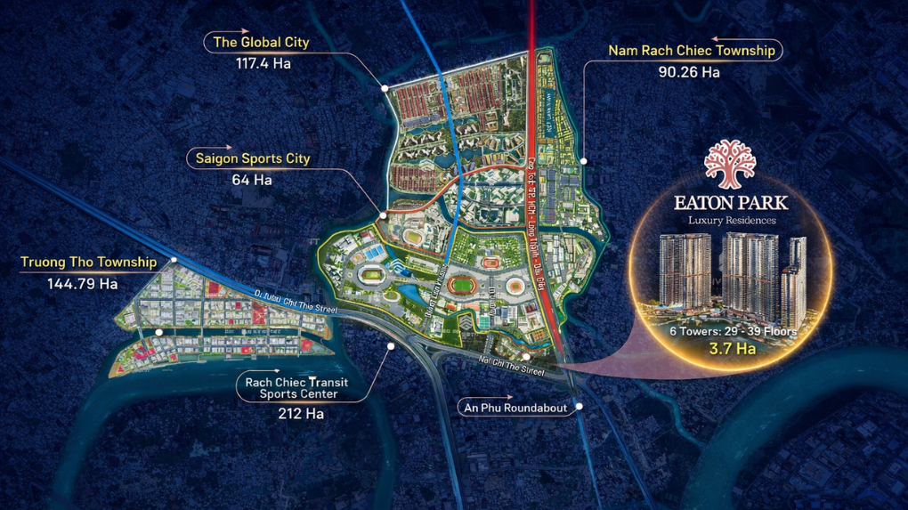 Eaton Park is a high-end residential development by Gamuda Land, strategically located on Mai Chi Tho Boulevard in An Phu Ward, Thu Duc City (Ho Chi Minh City). The project is master-planned on a site of approximately 3.76 hectares, envisioned as a modern apartment complex that integrates green living spaces with international-standard amenities.
