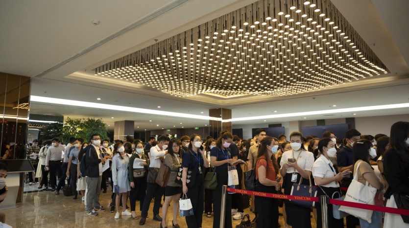 Long lines of people waiting in line to check in at Vincom Mega Mall Thao Dien