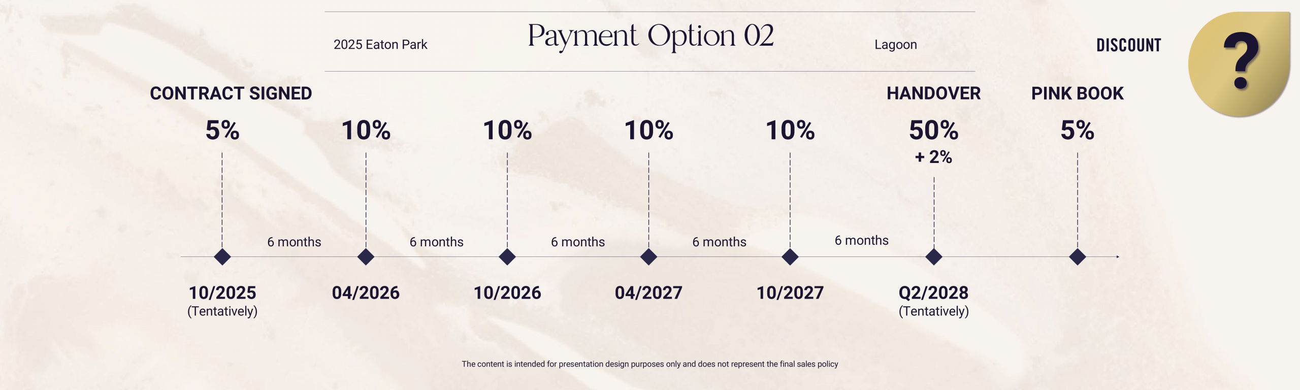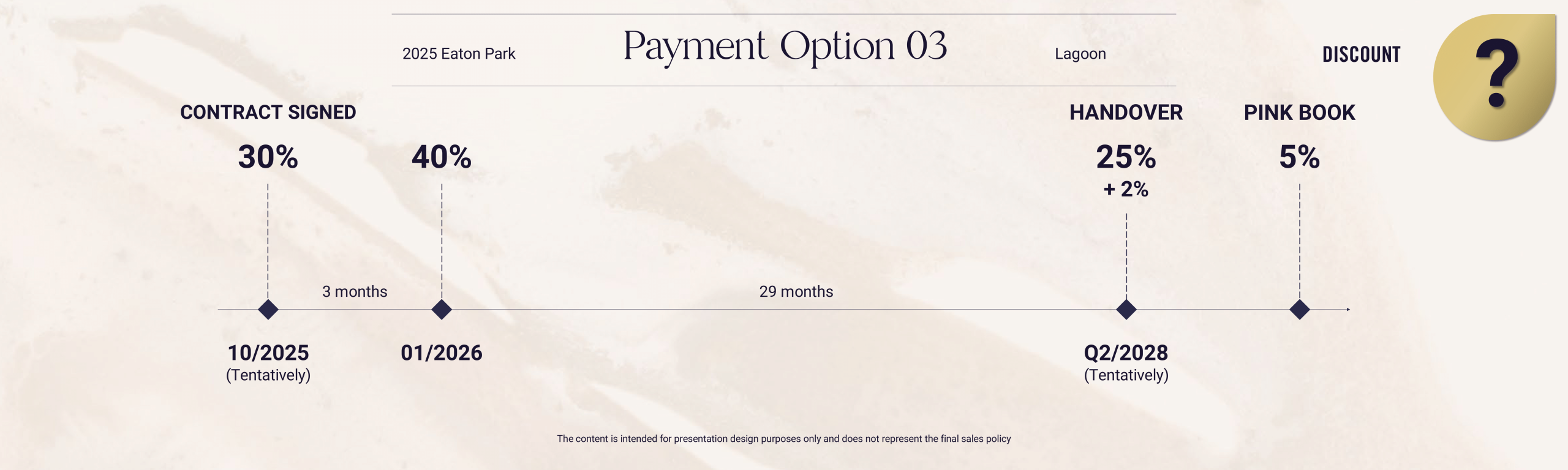 For investors looking to accumulate assets or speculate on rising property values, Eaton Park provides incentives for early full payments, such as significant discounts on total price.