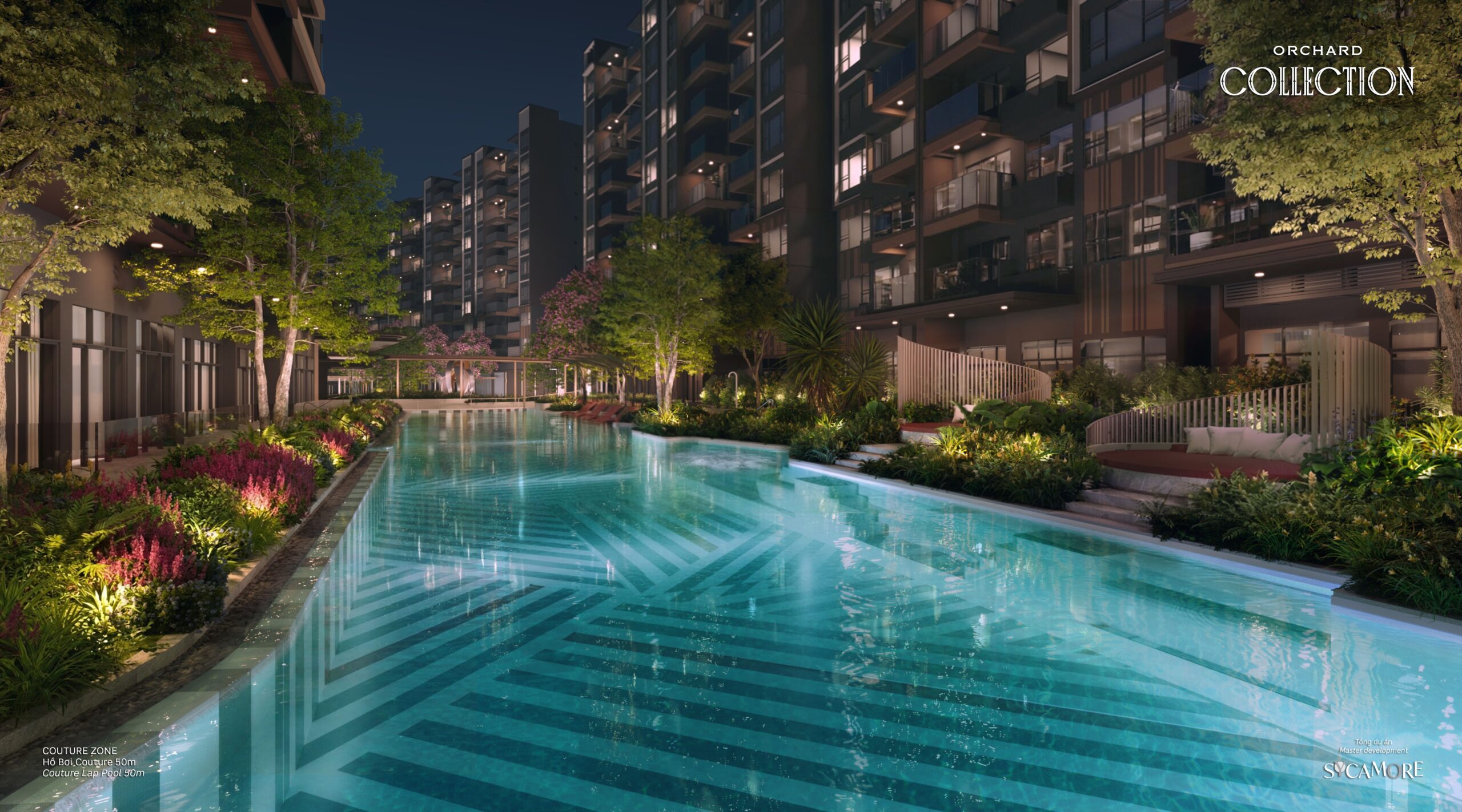 Khu COUTURE nổi bật với bể bơi 50m, Pool Bar view đêm, Maze Amphitheater và Couture Pool House — không gian sống xa hoa theo đúng nghĩa resort 5 sao.