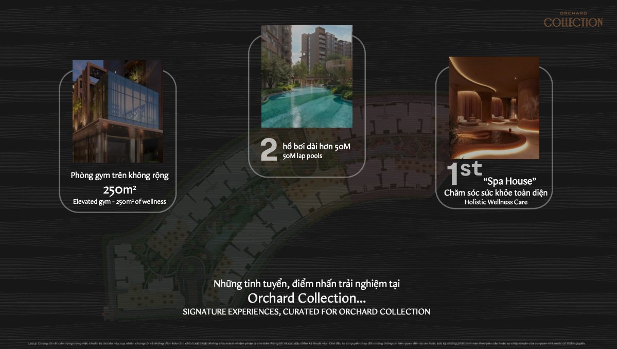 Điểm nổi bật nhất của Orchard Collection là hệ thống 168 tiện ích được chia thành 2 khu biệt lập: MAISON (tầng trệt và tầng 1, dành cho cư dân tòa Atelier & Bespoke) và COUTURE (khu tiện ích riêng cho tòa Clio & Define). Mỗi cư dân có tiện ích riêng tư — không phải dùng chung với cả khu.